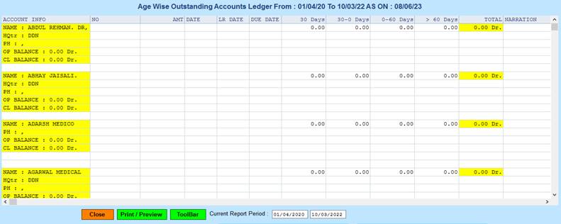 Reports->Inventory/Stock&Account Reports->Accounts-> Account Ledger -> Age Wise OutStanding