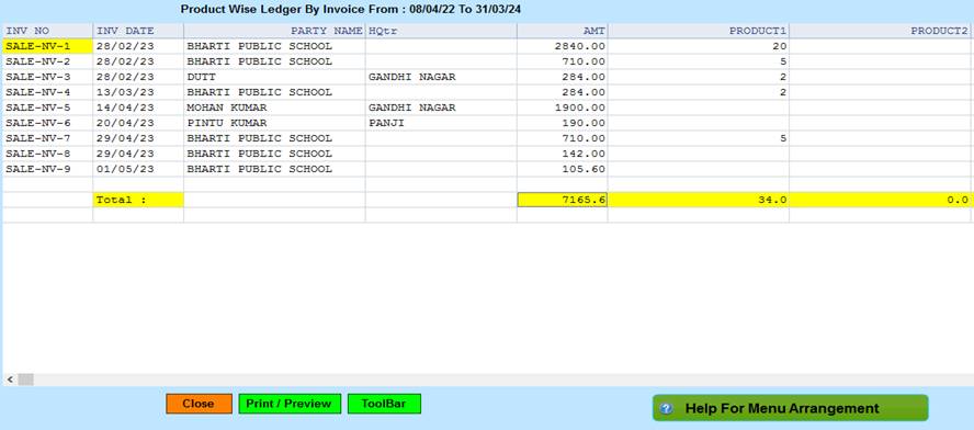 Reports->Territory/Management Reports -> Territory Analysis->Product Ledger By Invoice -> All.