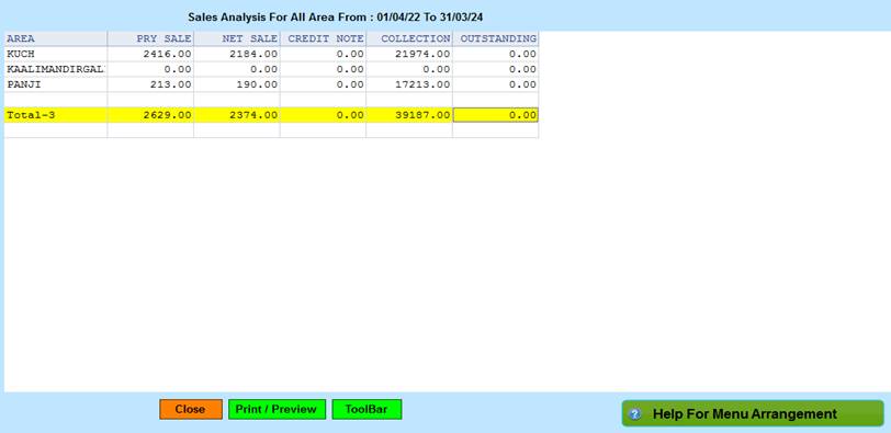Reports->Territory/Management Reports -> Territory Analysis-> Overall Performance ->All Area Wise Sales Analysis