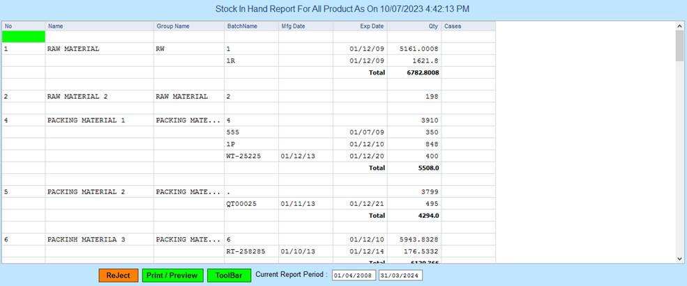PMS ALL Reports -> Production Section -> Reports -> Stock Report-> All Stock Item Wise.