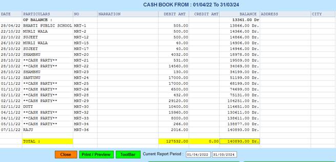 Reports->Inventory/Stock&Account Reports->Accounts-> Account Book ->Cash Book