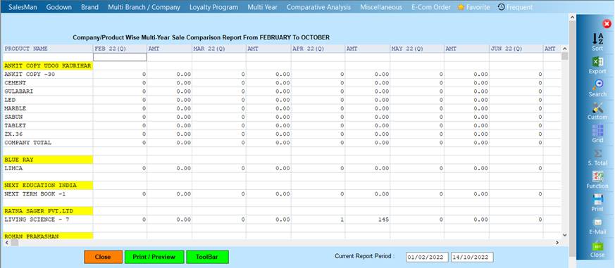 Reports->Salesman->Multi Year->Company Product Sale Comparision