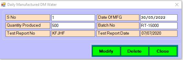 Reports>Production Section>Mfg Entry>Analysis Entry> D.M. Water Mgt->Daily Mfg Water
