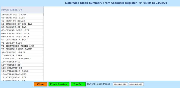 Reports->Inventory/Stock&Account Reports->Accounts-> Account Book -> All Advance Register ->Date Wise Stock Summary.