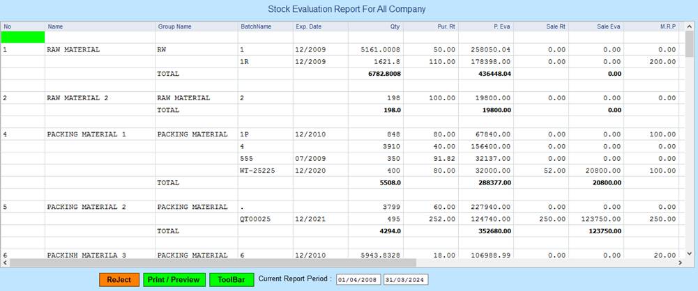PMS ALL Reports -> Production Section -> Reports -> Stock Report-> Evaluation All Item Wise.