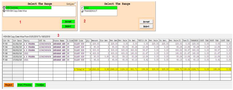 Definition: This will show GST Sale report, based on the selection (HSN Summary/Bill Copy Date Wise, Sale/Transfer Out) with Inv No, Inv Date, Party Name, GST No, State Name & Code), HSN No, Qty, Amt taxes, and other information.
