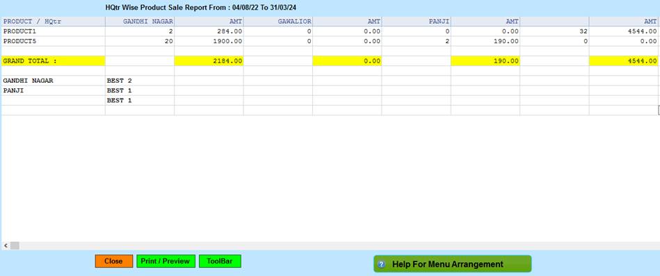 Reports->Territory/Management Reports -> Territory Analysis->Analysis(TSNC) ->Group Wise/Product Wise Report.