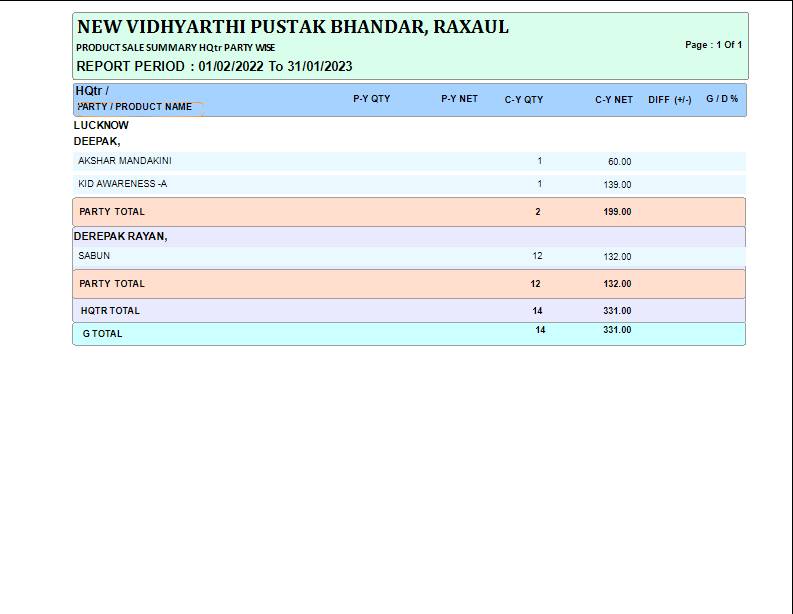 Reports->Multy Year->HQtr/Party/Product Sale Summary M. Year
