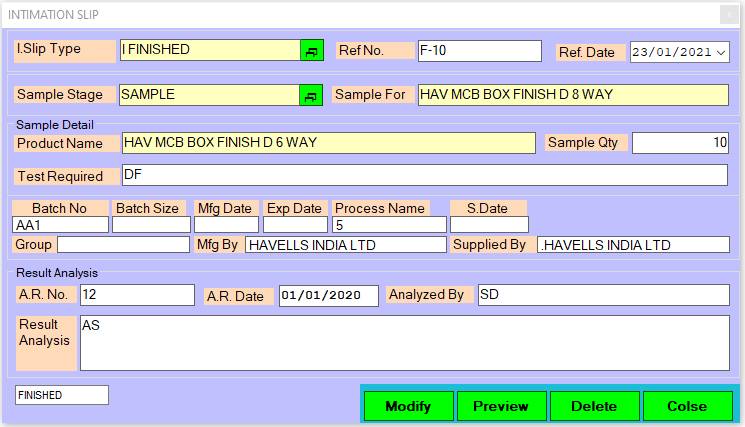 Reports>Production Section>Mfg Entry>Analysis Entry>Q C Dept->Intimation Slip