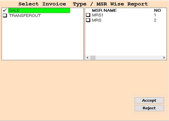 2. In this Window Select Invoice Type And MSR Name According To Your Need for Show Report, Select Any One or Multiple