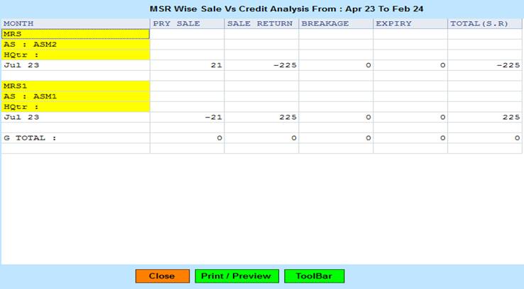 Reports-> Territory/Management Reports ->Management Comparative->MSR Analysis ->MSR Sales/Credit.