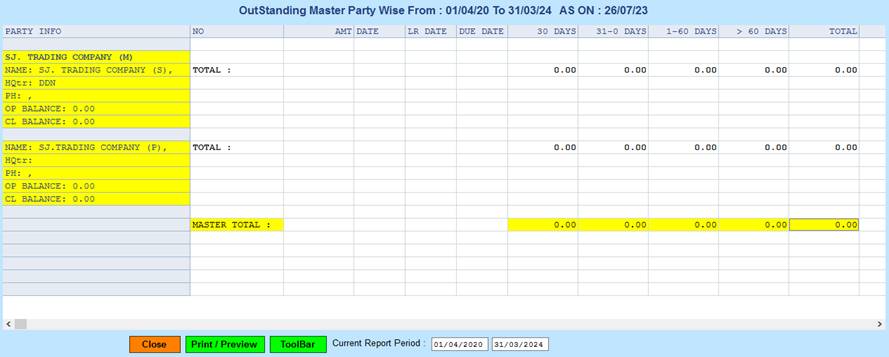 Reports->Inventory/Reports -> Accounts -> Accounts Special -> Master Outstanding.