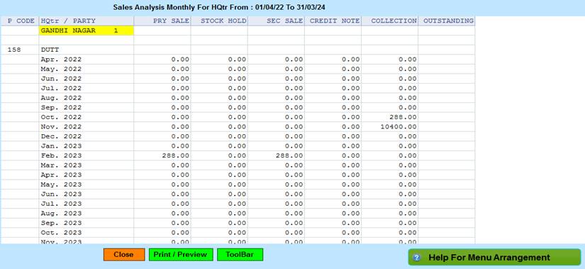 Reports->Territory/Management Reports -> Territory Analysis-> Overall Performance -> Monthly HQtr Party Wise Sales Analysis