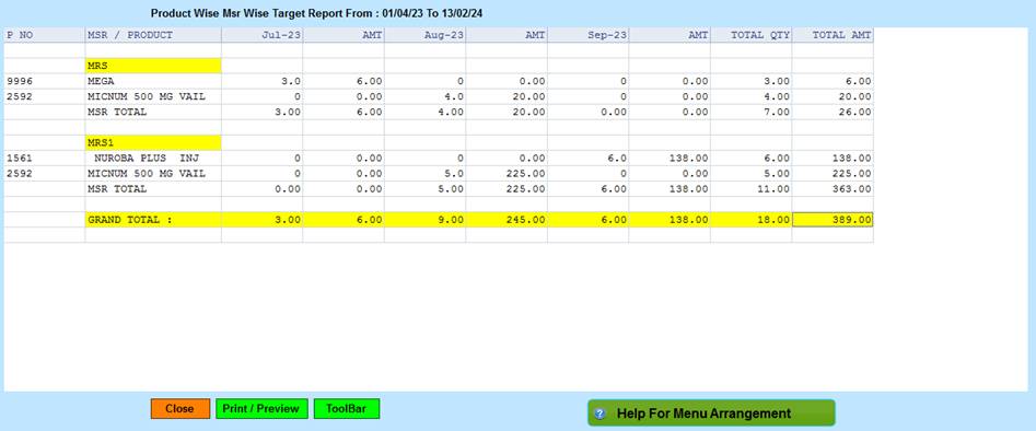 Reports-> Territory/Management Reports ->Management Comparative->Target Report ->Monthly MSR Wise Product Wise