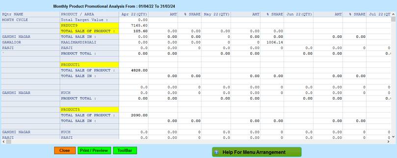 Reports->Territory/Management Reports -> Territory Analysis-> Territory Performance ->Monthly Product Promotional