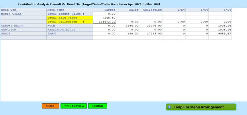 Reports->Territory/Management Reports -> Territory Analysis -> Contribution Analysis -> Overall Vs HQtr(Target/Sales/Collection)