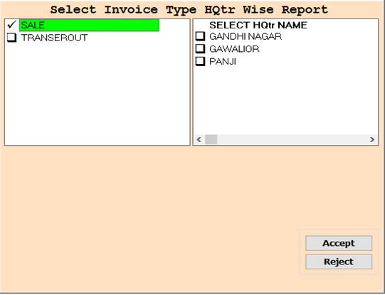 3. SALE :- Select For only Sale or HQtr Wise Report.