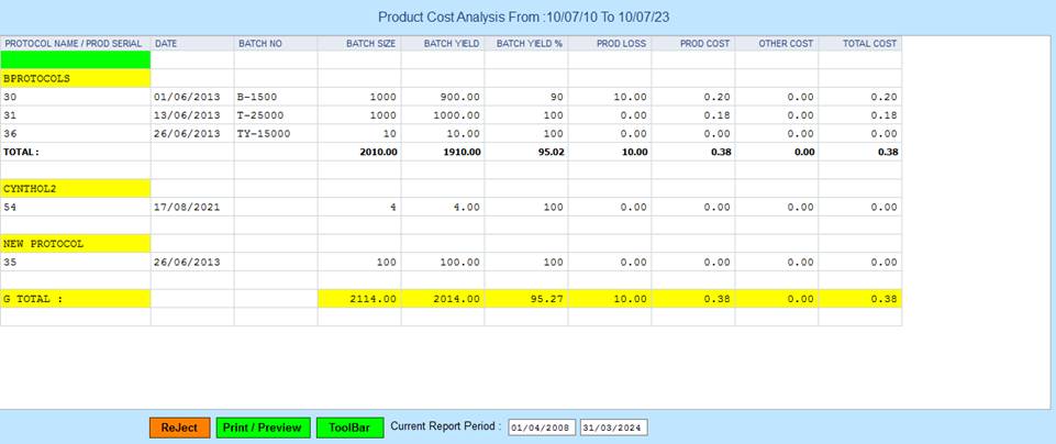 PMS ALL Reports -> Production Section -> Reports -> Production -> Product Cost Analysis.