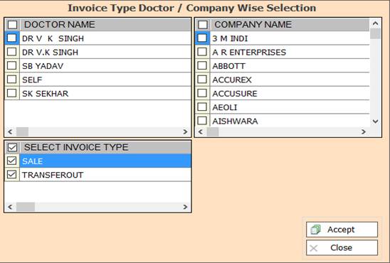 2. In this Window Select Doctor/Company Name And Invoice Type According To Your Need for Show Report, Select Any One or Multiple