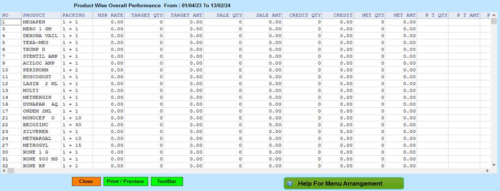 Reports -> Territory/Management Reports -> Management Comparative -> MSR Performance Copy->Product Wise OverAll Performance.