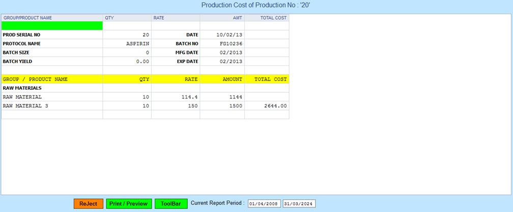 PMS ALL Reports -> Production Section -> Reports -> Production -> Production Cost.