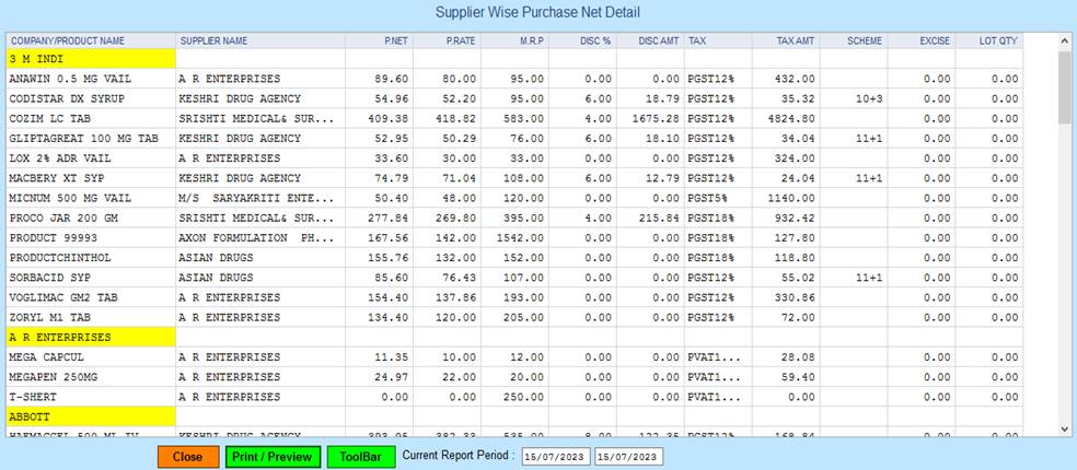 PMS All Reports -> Retailer Reports -> Supplier Analysis -> Purchase Net Detail.