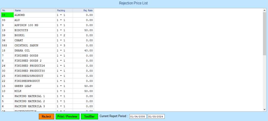 1. List Of Rejection Price.