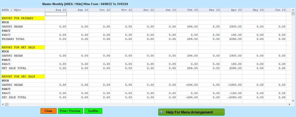 Reports -> Territory/Management Reports -> Territory Analysis -> Master Report-> Sale Tout/HQtr/Month/