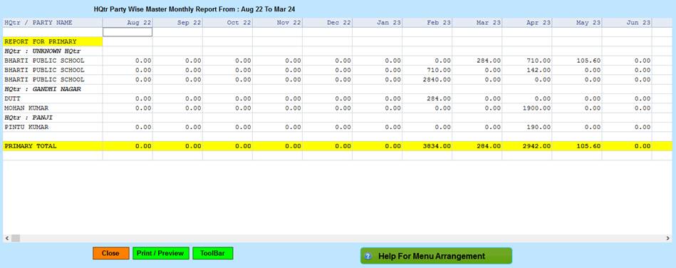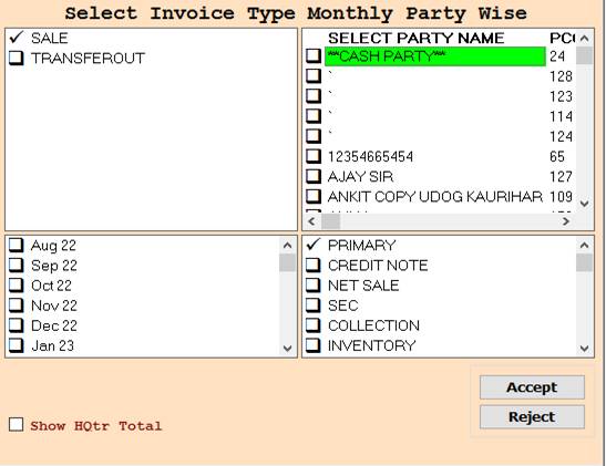 Sale-Tout/Party/Monthly/Master HQTR Wise Report