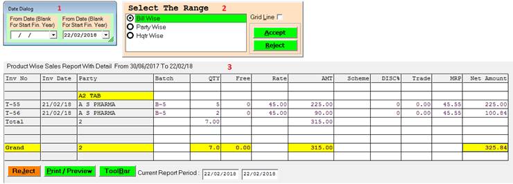 Definition: This report will show Product wise sale report (Bill Wise/Party Wise/Head Qtr Wise) with Inv No, Inv Date, Product Name, Batch No, Party Name and other details.