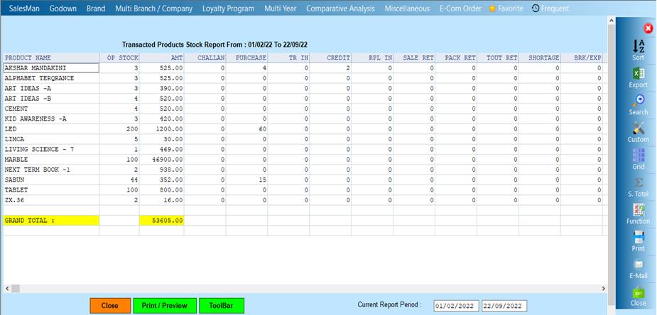 Reports->Comparative Analysis->Stock Report (Transacted Product)