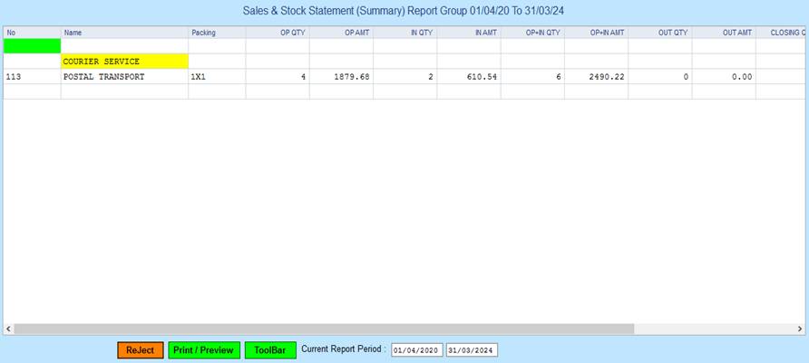 PMS ALL Reports -> Production Section -> Reports -> Sales & Stock Statement -> Group -> Summary.