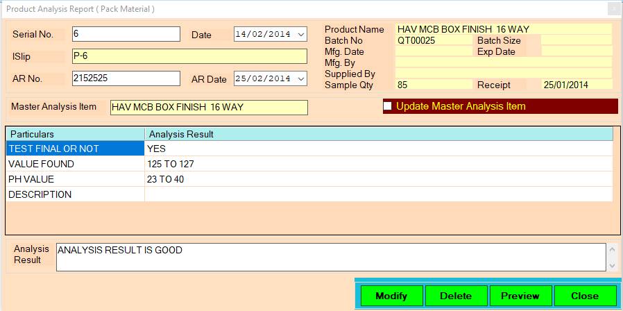 Reports>Production Section>Mfg Entry>Analysis Entry>Q C Dept->Test Analysis Report(Pack Material)
